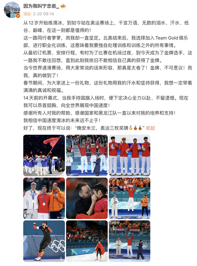 2月20日,宁忠岩在个人微博发文:“14天前的开幕式,当我手持国旗入场时,便下定决心全力以赴、不留遗憾。现在我可以昂首挺胸,向全世界展现中国速度!”